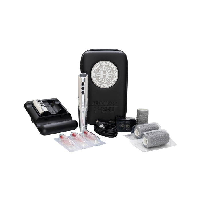 Om du köper Bishop PMU Wand Full Set får du en Bishop PMU Wand-maskin, två batteripaket, en dockningsstation med platser för både batterier och maskinen, och en 1,8 meters kabel av typ USB och väggadapter för att få allt att fungera. Du får också 3 engångshandtag och 3 nålpatroner, allt i ett snyggt och robust resefodral med blixtlås!
