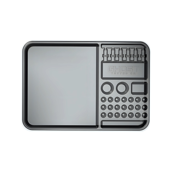 Dessa 100 % återvinningsbara PET-tråg passar perfekt till standard Ghost Tray Top, med förberedda avdelningar för allt du behöver, inklusive 25 hållare för bläckkoppar, 6 patronfack, 2 hållare för vattenmuggar, en extra hållare för mugg eller svamp och ett fack för linjer av glidmedel eller eftervård.