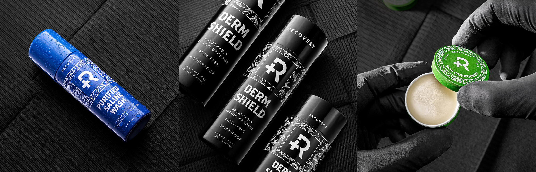 Recovery Aftercare skapade Derm Shield, en tatueringsfilm som finns i svarta och transparenta versioner, sÄvÀl som en lotion för tatuering, steril saltlösningsspray och tvÄl för eftervÄrd. Dermalize Pro erbjuder ett genomskinligt tatueringsbandage sÄvÀl som en sommarsÀker svart version, blÄ tvÄl, tatueringskrÀm och solkrÀm, medan dess Artcare Kit innehÄller allt din kund behöver för att fÄ sin tatuering att bli som allra bÀst.