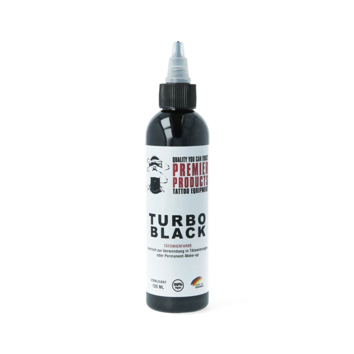 Turbo Black är det mörkaste svarta tatueringsbläcket som erbjuds av Premier Products. Lätt att använda och säkerställer att läkt arbete förblir svart och fylligt.