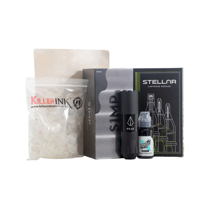 Innehåller en tatueringsmaskin i pennstil med trådlöst batteripaket, svart bläck och bläckkoppar, patroner och ett ark övningsskinn, så att du kan börja öva direkt. Allt i detta kit säljs individuellt på Killer Inks webbplats så att du kan fylla på det vid behov.