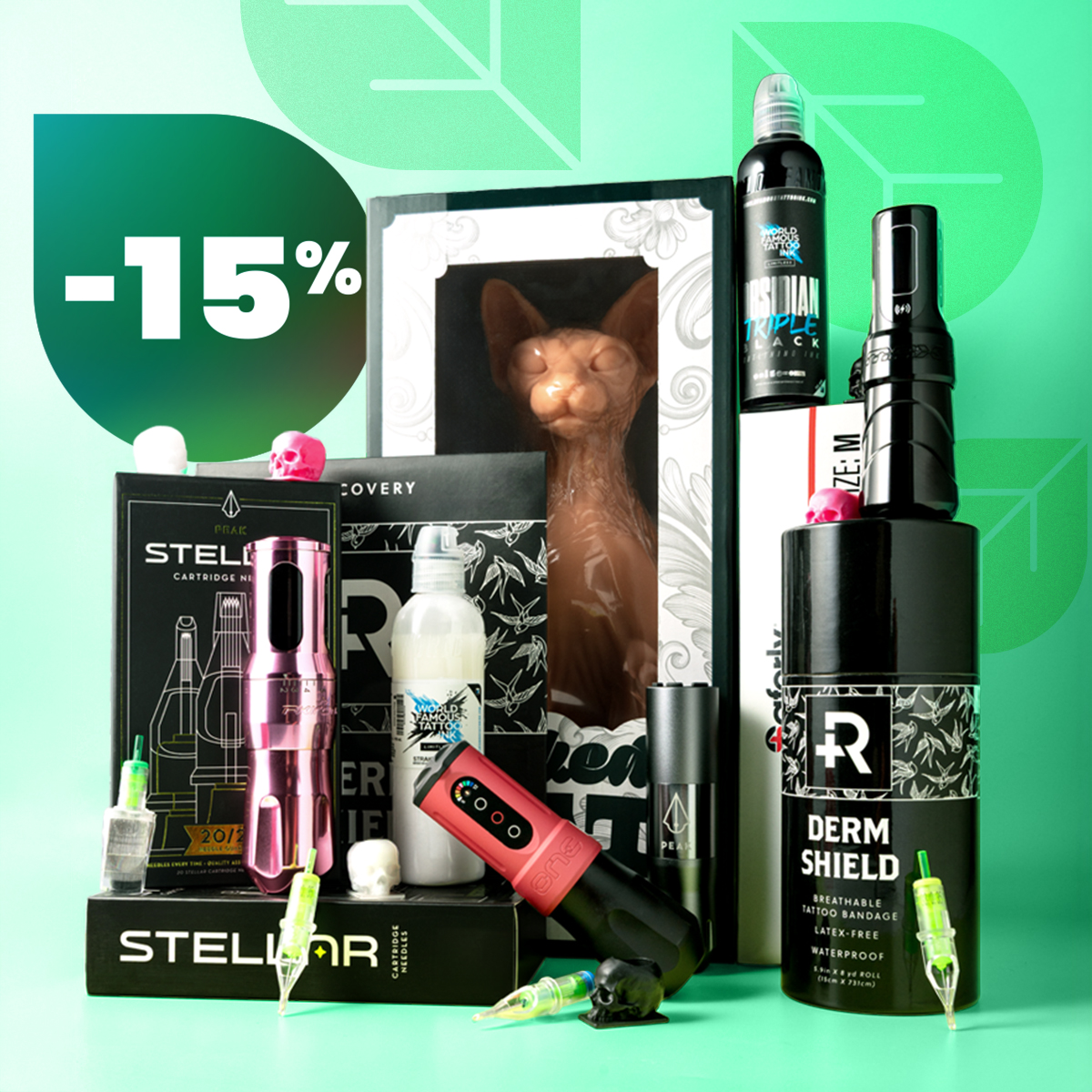 Vår vårrea är här! Få 15% rabatt på hela webbplatsen, från dina favoriter bland tatueringsmaskiner, patroner och bläck, till de hygienartiklar du behöver varje dag. Fyll på nu med förstklassiga märken och håll dig fullt utrustad för mindre kostnad!