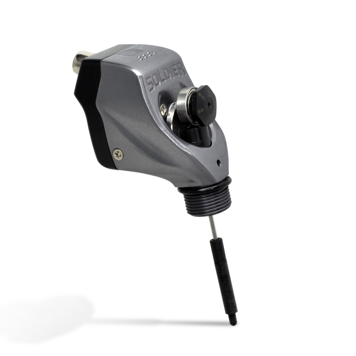 Soldier är en bra maskin för de som vill använda borstlösa motorer, kända för sin stabilitet och kontinuitet över tiden. Vår 5W Brushelss Maxonmotor börjar från 7 volt och går upp till 14 volt. Den är också perfekt för artister som vill kunna ändra slaglängden och mjukheten. Soldier har en unik magnetisk stroke excenter, som lätt kan dras ut och kopplas på en annan vinkel utan hjälp av verktyg för att uppnå önskad slaglängd. Inom loppet av endast några sekunder kommer den att snäppa fast på grund av att den är magnetisk. Soldier använder också en magnet för att trycka fram patronerna i 3 grader - hård, medium och mjuk, vilket gör denna maskinen helt finjusteringsbar.