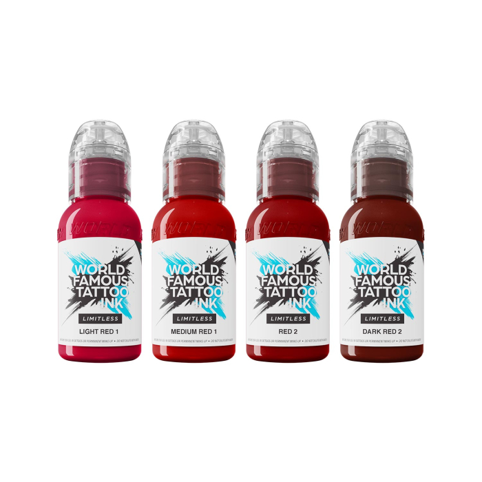World Famous Limitless Shades of Red Collection är en uppsättning av fyra flaskor med en rad röda tatueringsfärger, alla helt kompatibla med de uppdaterade EU REACH-förordningarna som infördes i januari 2023.